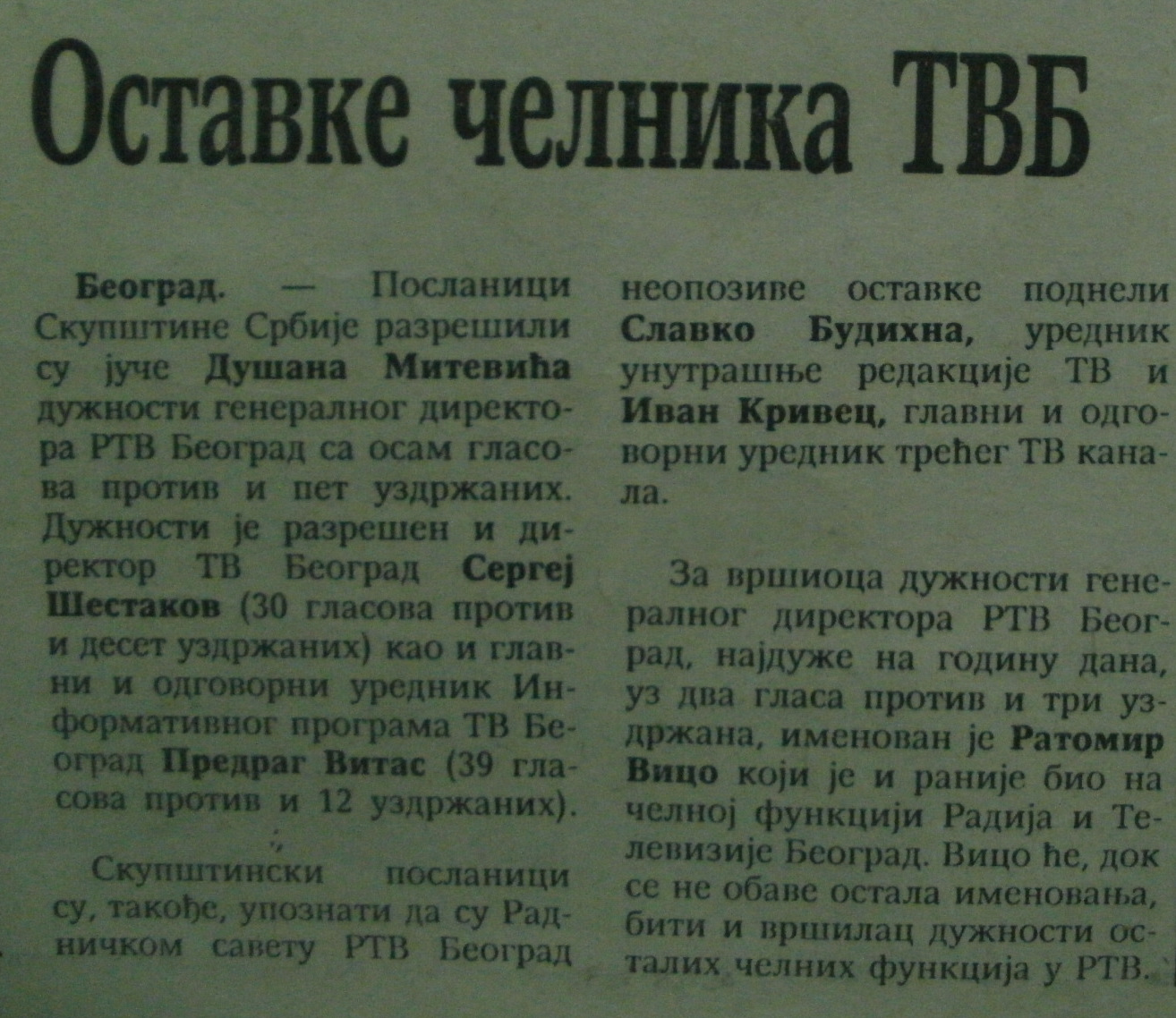 'Poslanici Skupštine Srbije razrešili su juče Dušana Mitevića dužnosti generalnog direktora RTV Beograd sa osam glasova protiv i pet uzdržanih. Dužnosti je razrešen i direktor TV Beograd Sergej Šestakov (30 glasova protiv i deset uzdržanih) kao i glavni i odgovorni urednik Informativnog programa TV Beograd Predrag Vitas. Skupštinski poslanici su takođe upoznati da su radničkom savetu RTV Beograd neopozive ostavke podneli Slavko Budihna, urednik unutrašnje redakcije TV i Ivan Krivec, glavni i odgovorni urednik Trećeg TV kanala. Za vršioca dužnosti generalnog direktora RTV Beograd, najduže na godinu dana, uz dva glasa protiv i tri uzdržana, izabran je Ratomir Vico, koji je i ranije bio na čelnoj funkciji radija i televizije Beograd.'