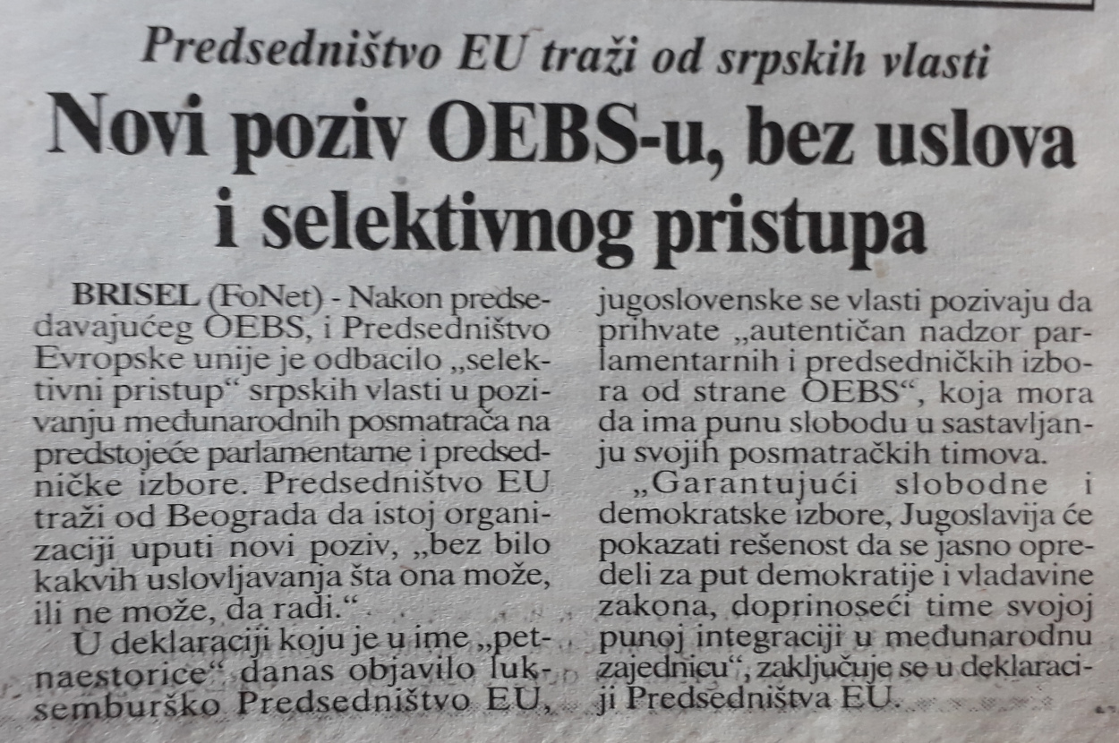 U Beogradu su boravili specijalni izaslanici SAD Ričard Holbruk i Robert Gelbard, koji su se sastali sa „vođstvom kompletne jugoslovenske opozicije, predstavnicima nezavisnih medija, i ovdašnjih nevladnih organizacija“. Kako je saopšteno, rezime tih razgovora bio je stav Holbruka da je „besmisleno bojkotovati izbore“. „Bezrezervnu podršku u tome imao je jedino od lidera SPO Vuka Draškovića“.