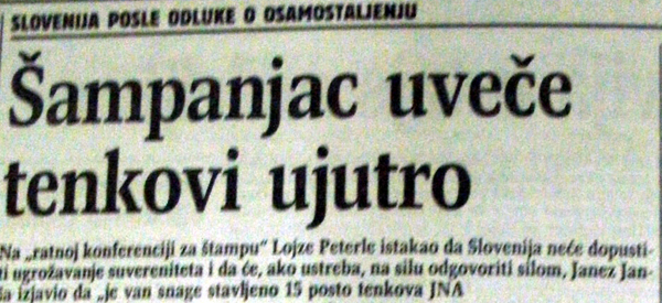 'Desetak minuta pre 21 čas slovenački teritorijalci su gradskim autobusima i teškim kamionima natovarenim peskom ogradili zgradu republičkog parlamenta. A samo pet minuta posle toga, četiri rakete koje su ispalile njihove nišandžije sa ljubljanske tvrđave Stari grad i tri aviona (pretpostavlja se JNA) promašile su cilj, a avioni su odleteli u pravcu jugozapada.'