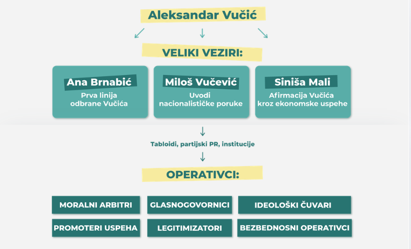 U vrhu komunikacione piramide nalaze se Ana Brnabić, Miloš Vučević i Siniša Mali, u ulozi velikih vezira. Oni su jezgro koje nosi dominantne poruke režima.