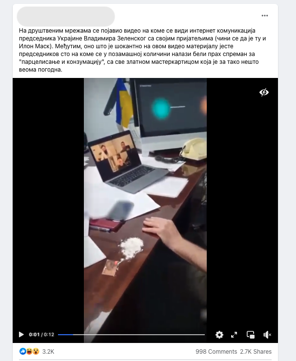 Video koji lažno prikazuje kokain na stolu Zelenskog pojavio se u 23. aprila na proruskim Telegram kanalima, da bi se kasnije, putem Tvitera i Fejsbuka, proširio i na naše govorno područje.