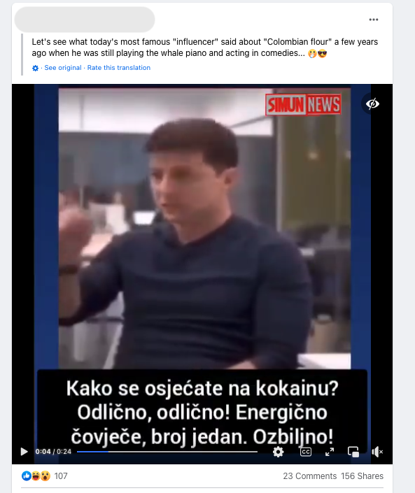 Engleski titlovi na viralnom videu lažno tvrde da je Zelenski, upitan kako se oseća „na kokainu”, odgovorio: „Odlično, odlično! Energično, čoveče, broj jedan. Ozbiljno! To je energija za ceo dan. Ustao sam u sedam ujutru… Živim na njemu.”