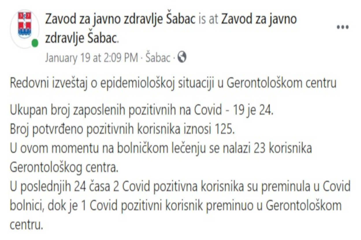 19. januara u 14 časova Zavod za javno zdravlje Šabac (ZJZ) objavljuje: “U poslednjih 24 časa 2 Covid pozitivna korisnika su preminula u Covid bolnici, dok je 1 Covid pozitivni korisnik preminuo u Gerontološkom centru”. Naveli su i da je “ukupan broj zaposlenih pozitivnih na Covid – 19 – 24; broj potvrđeno pozitivnih korisnika iznosi 125”, dok se “u ovom momentu na bolničkom lečenju nalazi 23 korisnika Gerontološkog centra”.