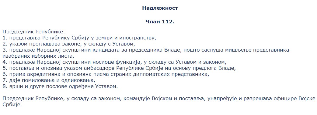 Naime, Ustav Srbije jasno propisuje ingerencije predsednika Srbije. U Zakonu o predsedniku, u članu 3, navodi se: